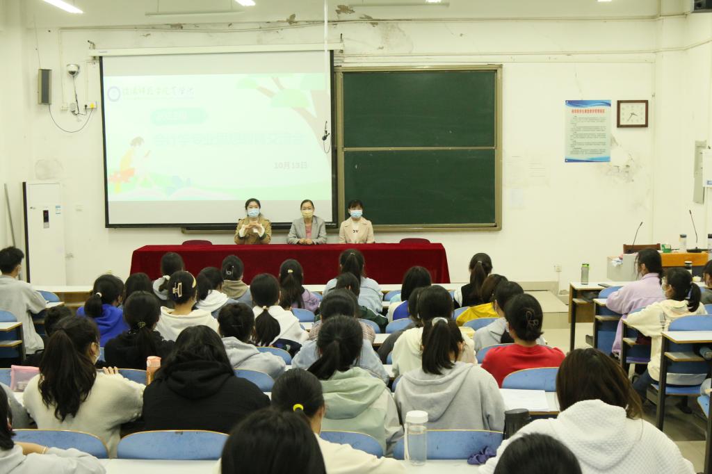 会议伊始,郭跃芳向大家介绍了会计学的专业优势和就业前景,极大地增强了同学们的专业认同感。同时,她指出会计学是一门综合性学科,具有很强的理论性、实践性和技术性,需要同学们合理规划老员工涯,科学高效地完成自己的本科学业。随后,郭跃芳为大家提供了本专业的一些学习方法、需要考取的证书以及未来的考研方向,并向同学们详细解释了学硕与专硕的区别。对于今后的专业学习,她向同学们提出了三点建议:一是要深刻认识到学位课程的重要性,注重提升自身的专业能力;二是要增强自主学习意识,给自己树立长期和短期目标,并不断努力实现;三是要注重自身兴趣、能力、人格等方面的培养,做“通才型”老员工。会议最后,会计学系老师朱倩、孙艳结合自身的学习经历,为同学们答疑解惑,希望大家在未来四年的老员工活中积淀自我、不断奋进,真正做到有所收获、有所成长。