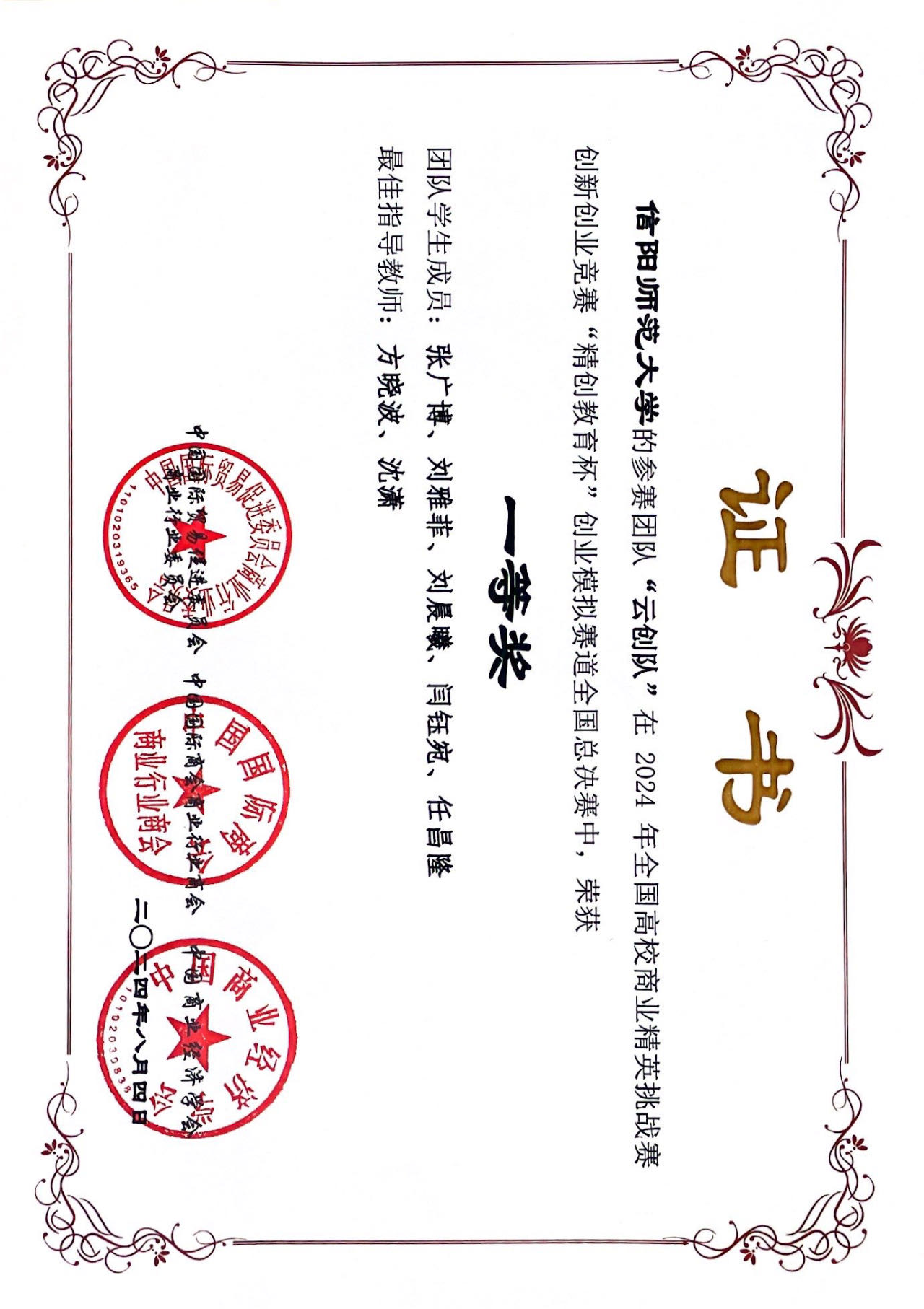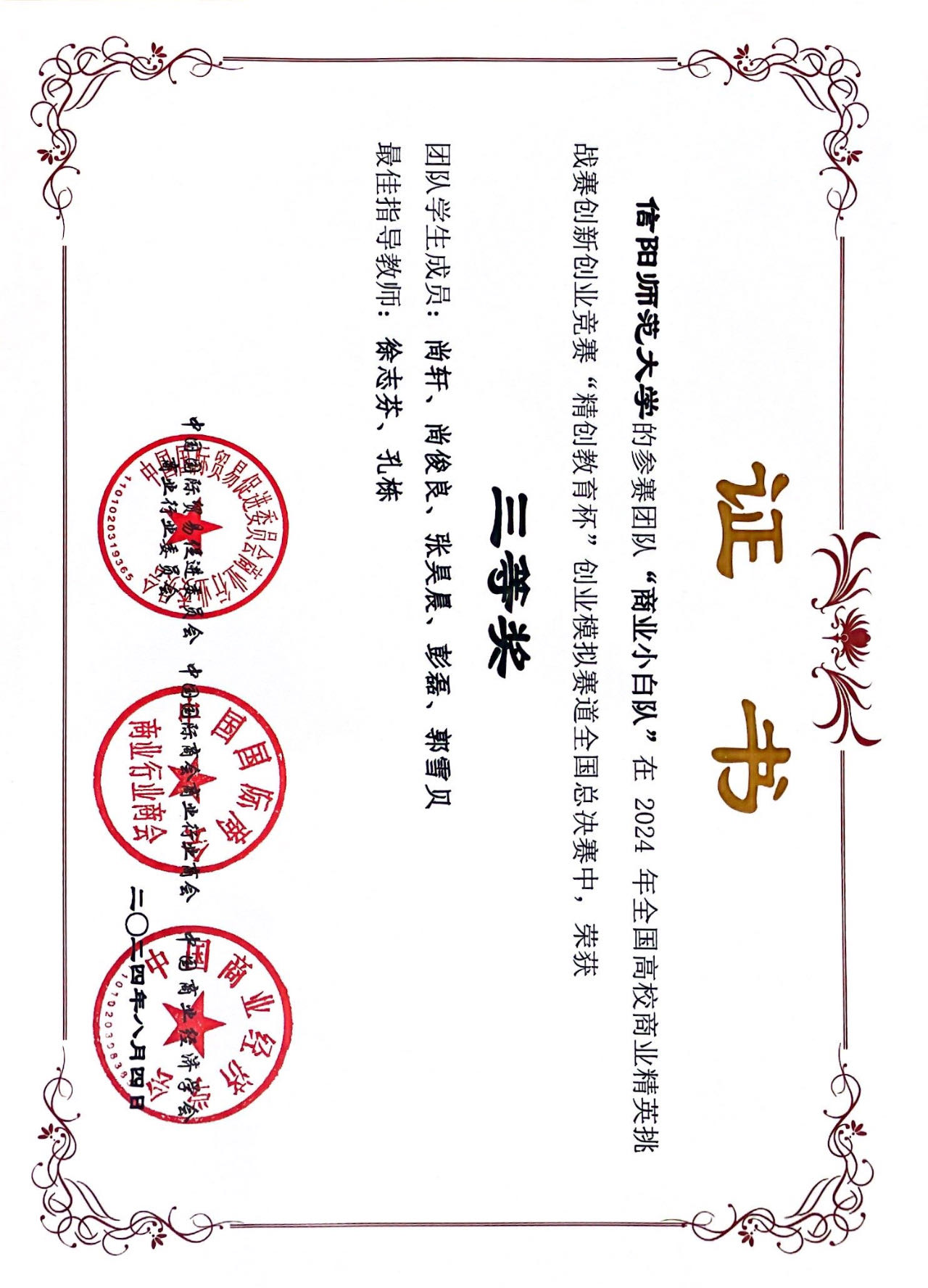 近日,在2024 年全国高校商业精英挑战赛创新创业竞赛“精创教育杯”创业模拟赛道全国总决赛中,太阳成tyc7111cc集团参赛的3支团队分别荣获全国总决赛一等奖、二等奖和三等奖,方晓波、沈潇、李秀艳、王重阳、徐志芬、孔栋获最佳指导教师称号。