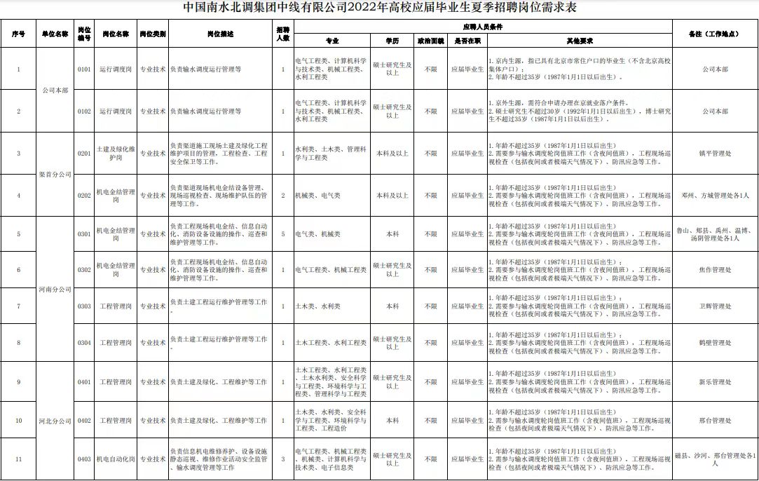 2.中国南水北调集团中线有限公司2022年夏季公开招聘工作人员岗位信息表