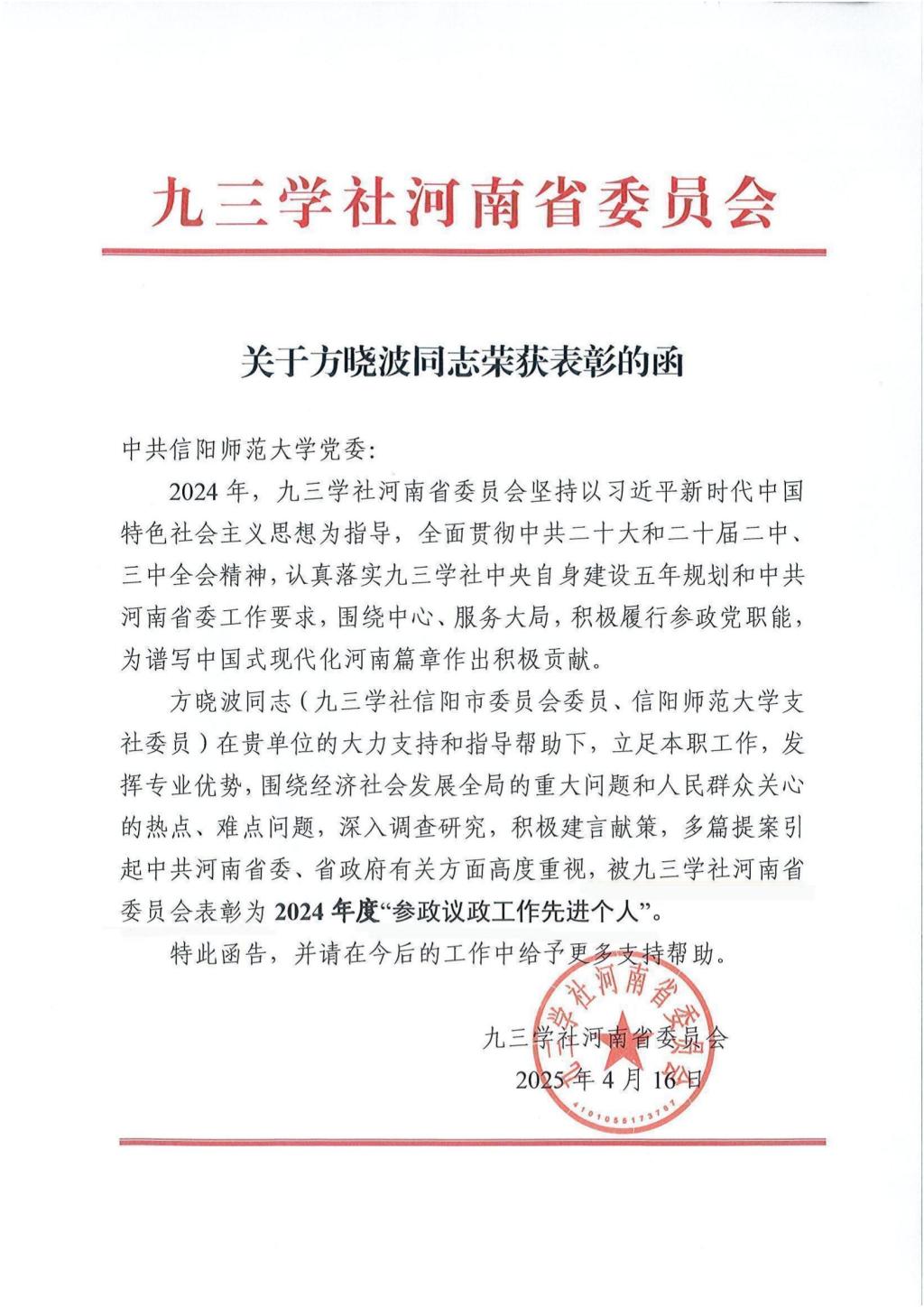近日,九三学社河南省委员会发布表彰决定,信阳市政协委员、九三学社信阳市委会委员、太阳成tyc7111cc集团方晓波博士荣获2024年度“参政议政工作先进个人”称号。