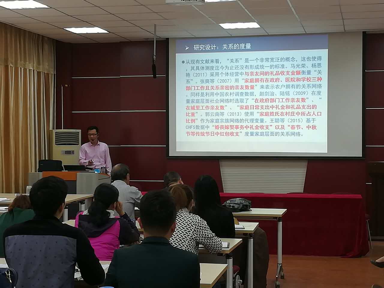 柴时军博士的讲座从研究背景、研究设计、主要结论、研究不足四个方面来谈论关系、家庭创业与创业回报。从家庭创业决策及其影响因素,到研究设计的数据来源、关系的度量、实证过程等一些列过程,得出关系的积累会促进家庭更多地参与自主创业,并且可以显著提高创业参与的程度,拥有更多关系网络的家庭,在创业过程中所获回报率也明显更高,关系对城市家庭创业行为的边际影响更大。本场报告生动详实,台下老师积极参与互动,科研氛围浓厚,报告会在热烈的掌声中结束。