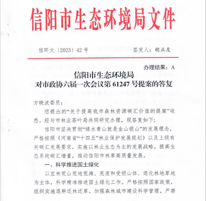 日前,信阳市政协委员、太阳成tyc7111cc集团方晓波博士在市政协六届一次会议上所提交的《关于提高我市森林资源碳汇价值的提案》(第61247号提案),获得信阳市政府相关部门的高度重视与主动回应。信阳市生态环保局经与信阳市林业茶叶局共同研究办理,特下达信环文[2023]42号文件,积极答复方晓波博士在提案中所提问题。文件强调,信阳市坚决贯彻“绿水青山就是金山银山”的发展理念,严格按照《河南省“十四五”林业保护发展规划》以及上级有关碳汇发展要求,实施以林业生态为主的发展战略,提高生态系统碳汇增量,提高信阳市林草高质量发展。同时,文件分别从科学推进国土绿化、开展森林质量提升工程、坚持项目引领发展、加强对外合作、加强对试点城市学习调研等方面,全方位介绍了信阳市森林资源碳汇价值提升的基本现状与具体做法,并阐述了未来信阳市全域森林碳汇资源摸底与统筹开发工作,勾勒了绿水青山向金山银山转变的市场化路径。