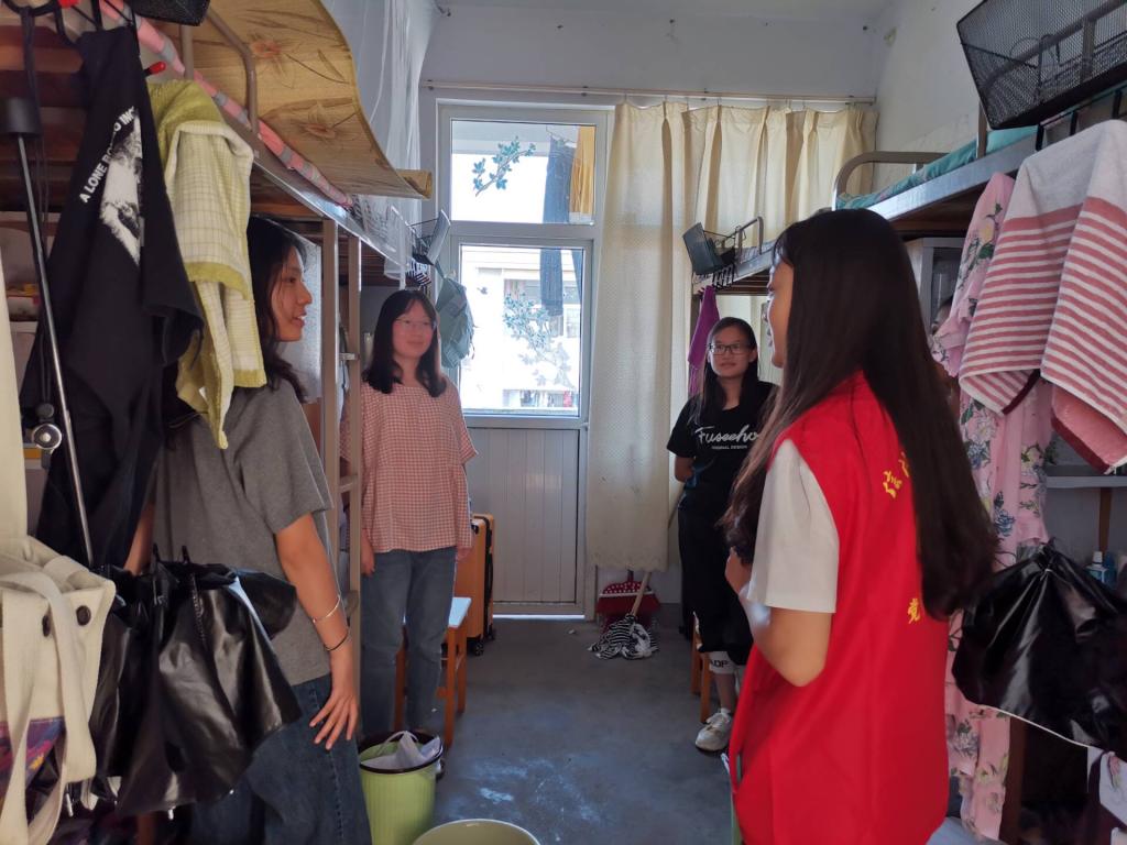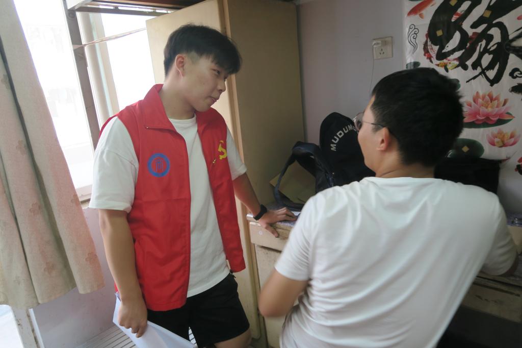在新生宿舍,员工党员们根据不同专业组成小组,深入到直系学弟学妹的宿舍,帮助新生及家长打扫宿舍,同时全面了解新生的情况,并为他们提供生活和学业上的经验和建议。