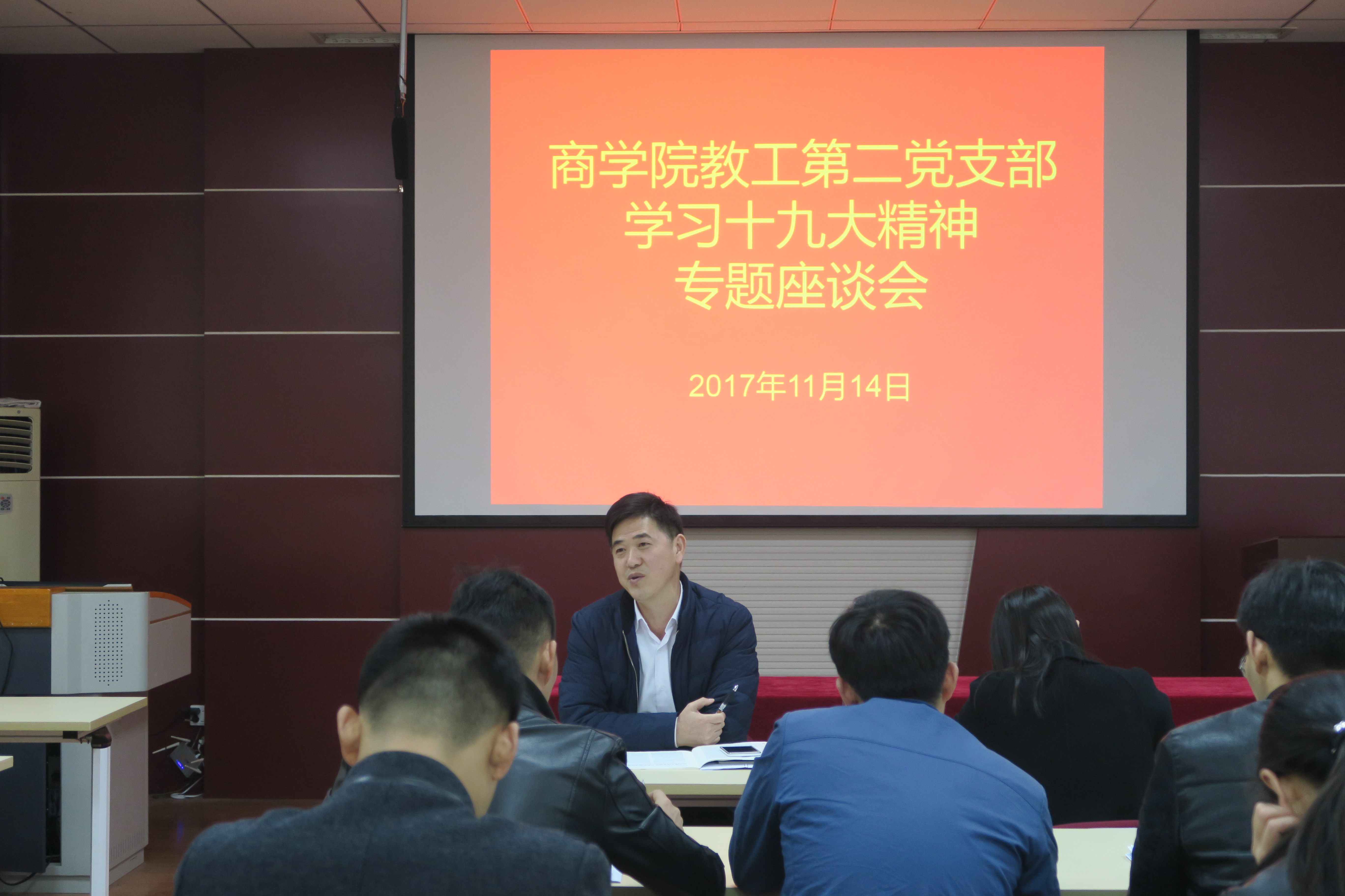 11月14日,商公司党委教工第二支部全体党员在管理科学楼310会议室召开“学习党的十九大精神”专题座谈会。商公司党委副书记梅士建及二支部全体党员参加了座谈会。座谈会由支部书记陈俭同志主持。