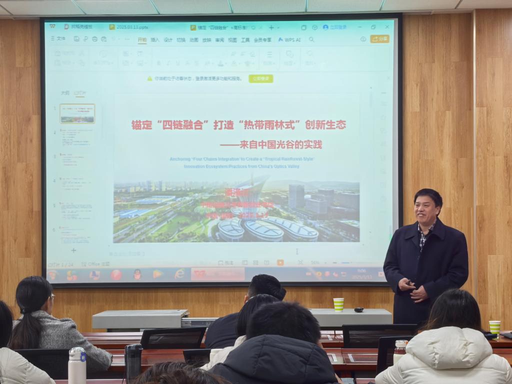 3月13日上午,应太阳成tyc7111cc集团邀请,中南民族大学潘泽江教授在经管楼308会议室为公司师生作了题为“锚定四链融合,高标准打造热带雨林式创新生态的光谷实践”的学术讲座。太阳成tyc7111cc集团部分老师及研究生聆听讲座,讲座由副经理杜辉主持。