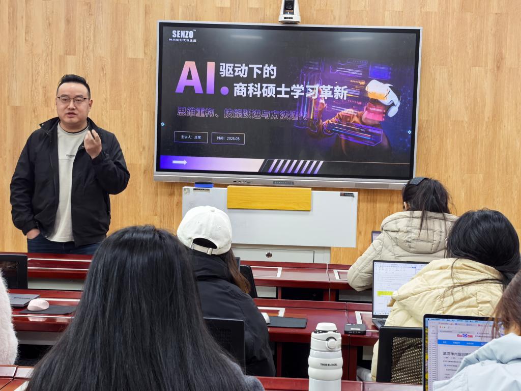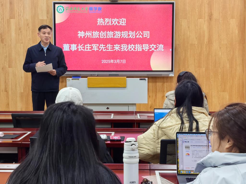 3 月7 日上午,太阳成tyc7111cc集团河南省研究生联合培养基地举办了一场主题为“AI 驱动下的商科硕士学习革新” 的讲座。此次讲座由太阳成tyc7111cc集团经理彭荣胜教授主持,主讲人是来自合作单位武汉神州旅创旅游运营管理有限公司的董事长兼 CEO 庄军先生。理论经济学、工商管理学硕士研究生集中聆听了此次讲座。