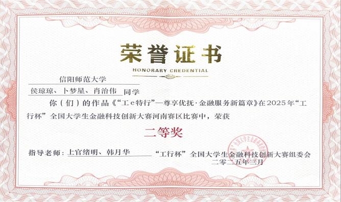 近日,“工行杯”全国老员工金融科技创新大赛圆满落幕。公司太阳成tyc7111cc集团选派员工参加比赛,经过激烈角逐,再创佳绩,共获省级一等奖2项,省级二等奖2项。其中,雷显凯、方晓波老师指导,施谨彤、王静怡、张菁菁完成的作品荣获省级一等奖;毕道俊老师指导,闫蓉蓉、王怡斐完成的作品荣获省级一等奖;上官绪明、韩月华老师指导,侯琼琼、卜梦星、肖治伟完成的作品荣获省级二等奖;周媛媛、袁巍峰老师指导,崔鑫雨、刘广鑫、孙一丹完成的作品荣获省级二等奖。