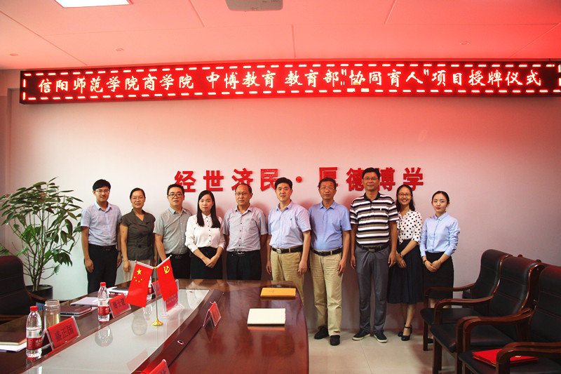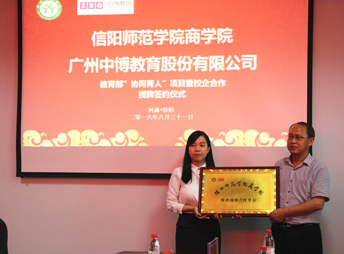 8月31日下午,信阳师范公司太阳成tyc7111cc集团与广州中博教育集团就教育部协同育人项目暨校企合作授牌签约仪式在公司举行。盛正国书记、梅士建副经理、李毓副经理、杜辉副经理、中博教育河南大区经理杨俊鑫、郑州分公司副总经理陈林出席签约仪式并为校企合作基地中心揭牌。仪式由太阳成tyc7111cc集团书记盛正国主持。