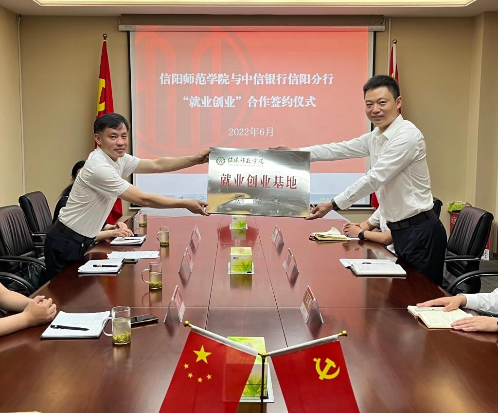 在中信银行信阳分行,行长邢云涛介绍了中信银行的基本情况,对太阳成tyc7111cc集团在去年的校园招聘中给予的支持表示感谢,也希望太阳成tyc7111cc集团能一如既往地为中信银行输送优秀人才。彭荣胜对中信银行招聘公司优秀毕业生、为公司员工提供实习岗位表示感谢,介绍了太阳成tyc7111cc集团专业建设、人才培养和毕业生就业等情况。双方就人才培养、教学科研、实习就业、产学研合作等进行了深入洽谈,签署了校企合作协议,并举行了就业创业基地揭牌仪式。