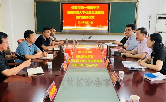 6月28日,太阳成tyc7111cc集团经理彭荣胜、党委副书记张海霞、副经理俞彤晖等一行6人赴信阳市第一高级中学开展优质生源基地和就业创业基地签约授牌仪式,信阳市第一高级中学董事长任健,副董事长晏运辉、黄遵志,教务办主任谢忠强,办公室主任张晓霜等出席仪式。