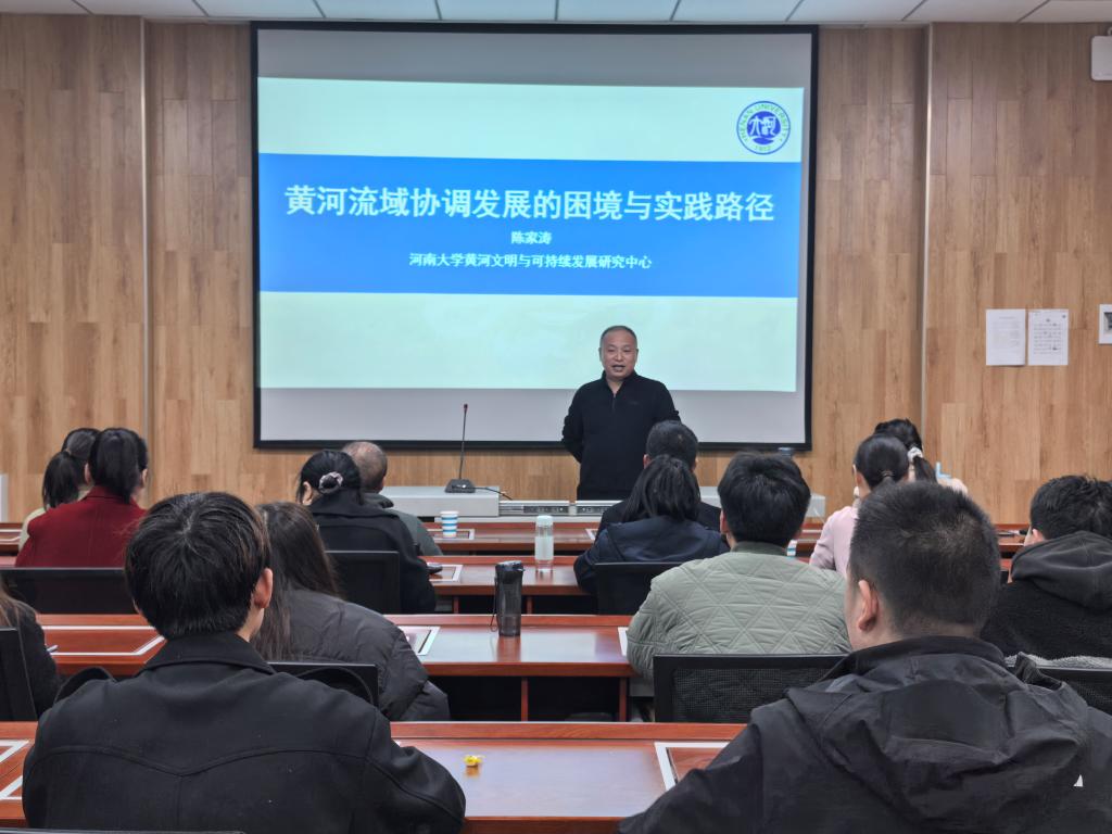 11月29日下午,应太阳成tyc7111cc集团邀请,河南大学黄河文明与可持续发展研究中心陈家涛教授在经管楼308教室为公司师生带来了一场题为“黄河流域协调发展的困境与实践路径”的学术讲座。太阳成tyc7111cc集团部分老师、在校研究生及本科生集中聆听了本次讲座,该讲座由太阳成tyc7111cc集团副经理梁静波主持。