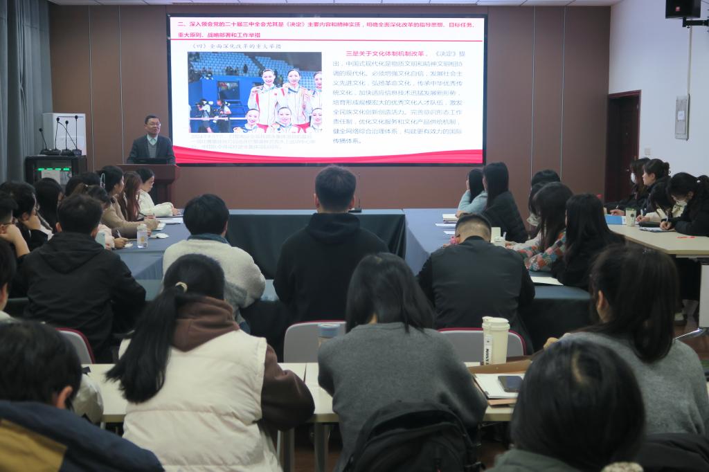李辉以《学习贯彻二十届三中全会精神,争做新时代有为奋发的好青年》为题,围绕三个方面宣讲党的二十届三中全会精神。一是深入学习党的二十届三中全会精神,深刻认识进一步全面深化改革,推进中国式现代化的重大意义。二是深刻领会党的二十届三中全会尤其是《决定》主要内容和精神实质,明确全面深化改革的指导思想、目标任务、重大原则、战略部署和工作举措。三是切实发挥好教育科技人才体制机制的基础性、战略性、支撑性作用,服务好中国式现代化建设实践。