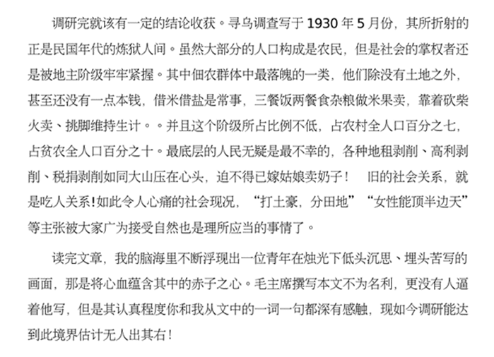 《寻乌调查》是毛泽东主席在土地革命的关键时期所作的重要调研,其内容包括地理位置、历史沿革、行政区划、自然风貌、水陆交通、土特产品、商业往来、商品种类、货物流向、税收制度、人口成份、土地关系、阶级状况、剥削方式、土地斗争等等,全文共分为五章39节,超过八万字。